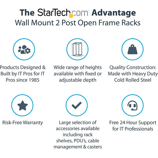 StarTech.com Rack réseau mural robuste à 2 montants 6U, rack serveur à cadre ouvert de 19 pouces pour équipement informatique, rack de données à montage mural RK619WALLO