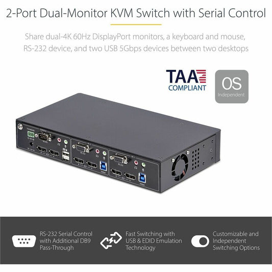 StarTech.com Commutateur KVM DisplayPort à 2 ports pour deux écrans, contrôle série RS232, 4K 60 Hz, 2 ports USB 5 Gbit/s, conforme TAA P2DD46A22-KVM-SWITCH