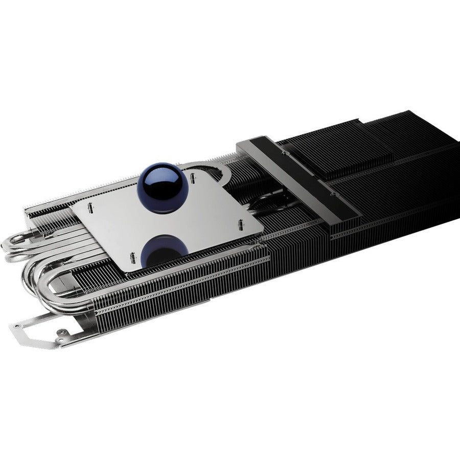 Le dissipateur de chaleur aspire la chaleur dans des caloducs qui la transportent à travers une pile d'ailettes qui remplit la majeure partie de l'empreinte de 2,9 emplacements de la carte.