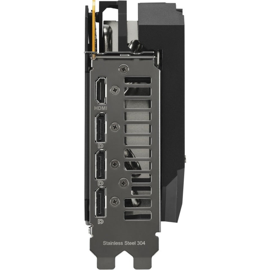 Le dessous de la carte présente d'autres améliorations. La majeure partie de l'arrière est enveloppée d'une plaque arrière protectrice en métal qui présente une large ventilation. Cette ventilation permet à l'air chaud de s'échapper vers les ventilateurs d'extraction du châssis au lieu d'être recyclé dans le refroidisseur du GPU. Un support de GPU offre une stabilité supplémentaire à la connexion critique entre la puce et le dissipateur de chaleur. L'acier inoxydable est utilisé pour le support d'E/S afin de protéger les ports et d'assurer un montage plus sûr. Et un commutateur Dual Bios idéalement placé permet de personnaliser le profil de performances par défaut de la carte sans logiciel.