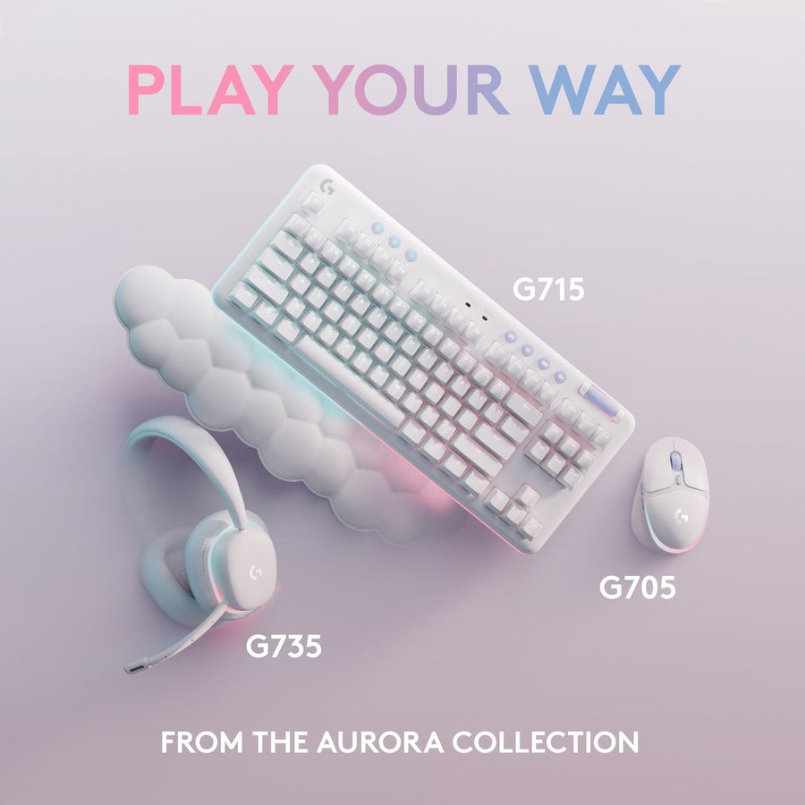 - De la collection Aurora : les équipements de jeu fonctionnent mieux ensemble ; le casque Logitech G735, la souris G705 et le clavier Logitech G715 partagent le même design inclusif et la même esthétique de rêve ; vendus séparément