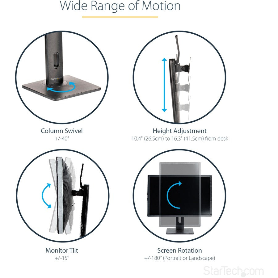 - PLAGE DE MOUVEMENT : Le support de moniteur ergonomique augmente le confort et la productivité avec une inclinaison de +/-15°, une rotation de l'écran de +/-180° (portrait/paysage) ; la colonne entière pivote de +/-40°