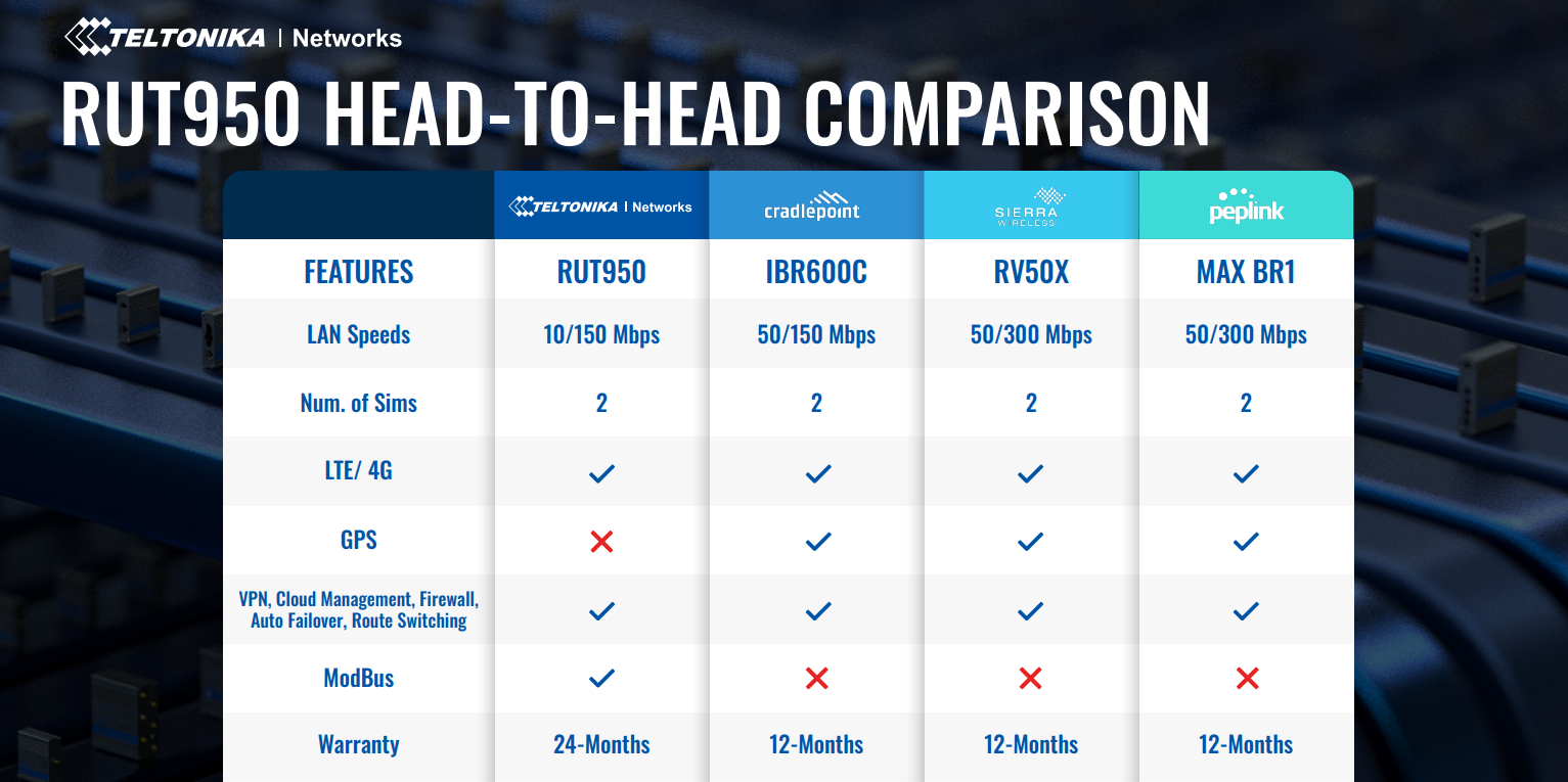 - Le RUT950 est un routeur Wi-Fi 4G LTE industriel hautes performances conçu comme source Internet principale/de secours et garantit une connexion Internet fiable avec un débit de données élevé et une redondance des données.