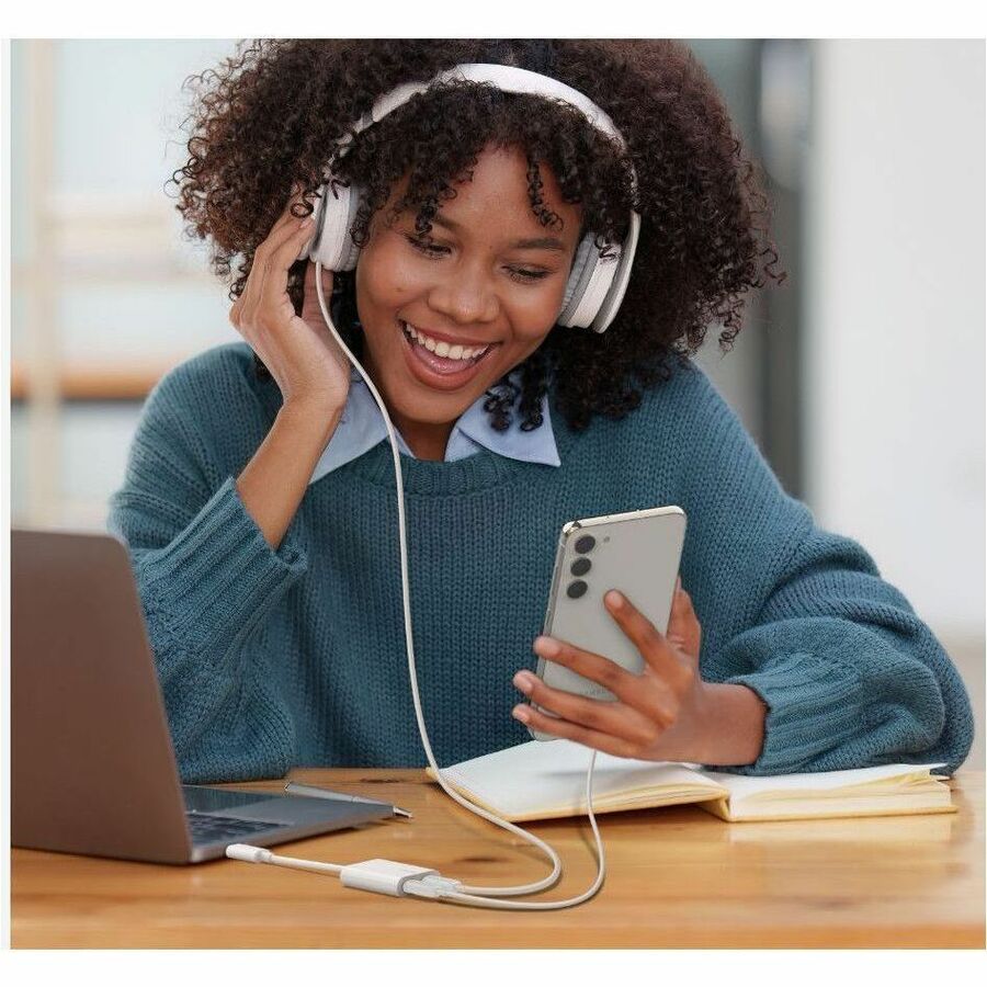 A compact solution for charge and audio, this USB-C adapter is perfect when you're on the go. Plus, each port will work for either charging or listening, so there's no need to check which one to use. Just connect and you're all set.