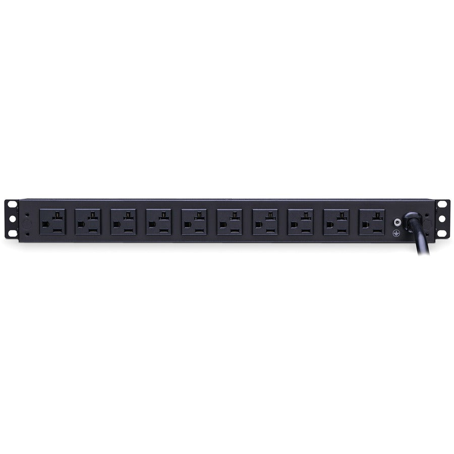 The CyberPower 10-outlet rack mount basic power distribution unit (PDU20BT10R) provides 120V 20A output. It distributes power to 10 NEMA 5-20R receptacles from a single NEMA L5-20P twist lock plug, with unfiltered electrical pass-through. Designed for datacenters and other electrically demanding applications, this unit has a rugged, industrial-grade metal housing and a 15-foot AC power cord. It can be mounted either horizontally or vertically, includes a cord retention tray and is ETL/RoHS certified. A lifetime warranty ensures that this PDU is free of defects in design, assembly, material or workmanship.