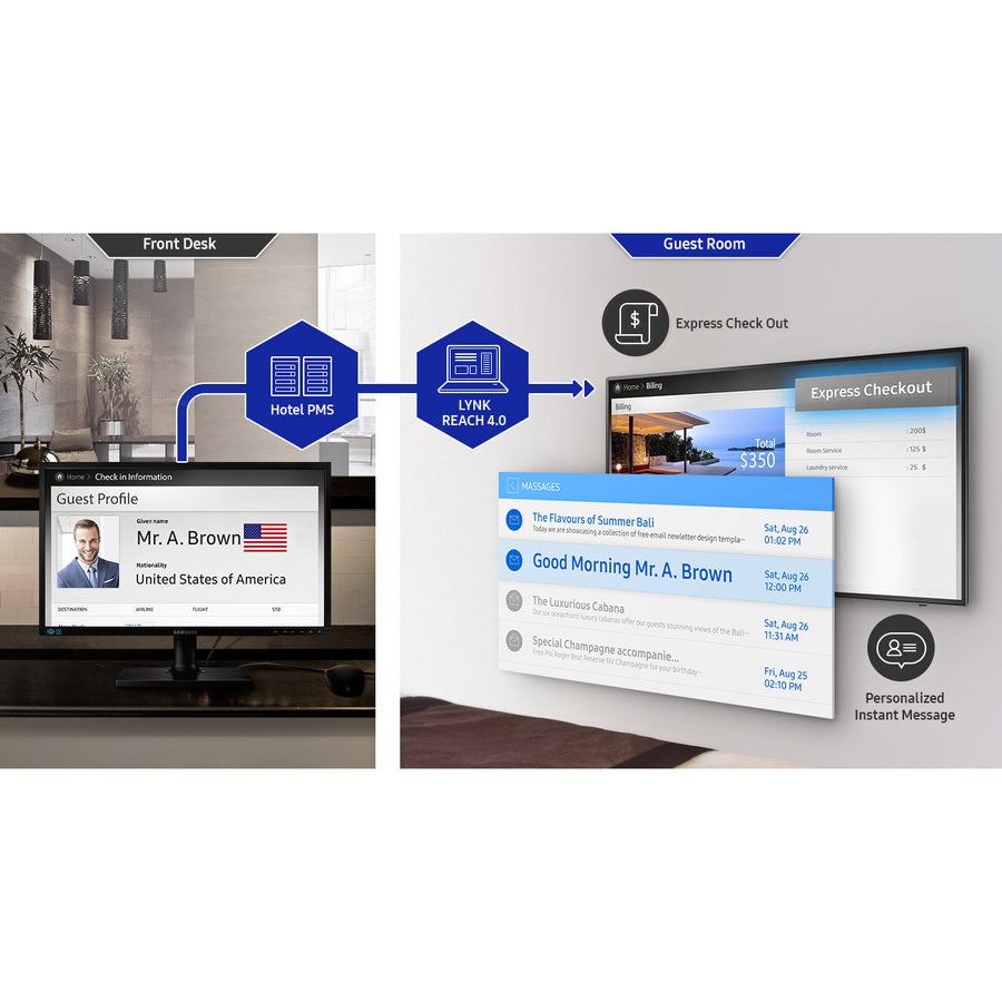 Hotels additionally can use the LYNK REACH 4.0 platform to deliver customized messages to guests relevant to their specific stay details or interests. As guests arrive, hotel operators can greet them with a personalized welcome message while also promoting on-site amenities and promotions. Once the stay concludes, LYNK REACH 4.0 offers express check-out to save guests the time and hassle of a trip to the lobby.