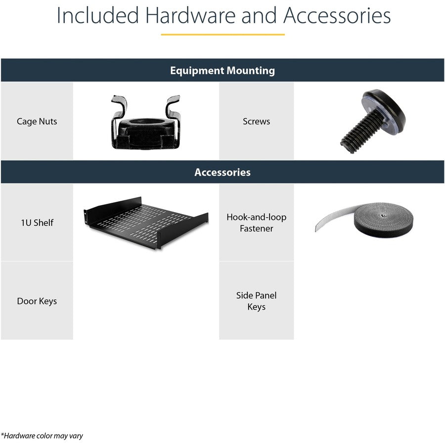 - ACCESORIES INCLUDED: IT Data Rack includes complete set of accessories: a shelf (CABSHELFV1U), roll of hook-and-loop fastener, 50 cage nuts and screws, & 2 pairs of keys for the front and side panels