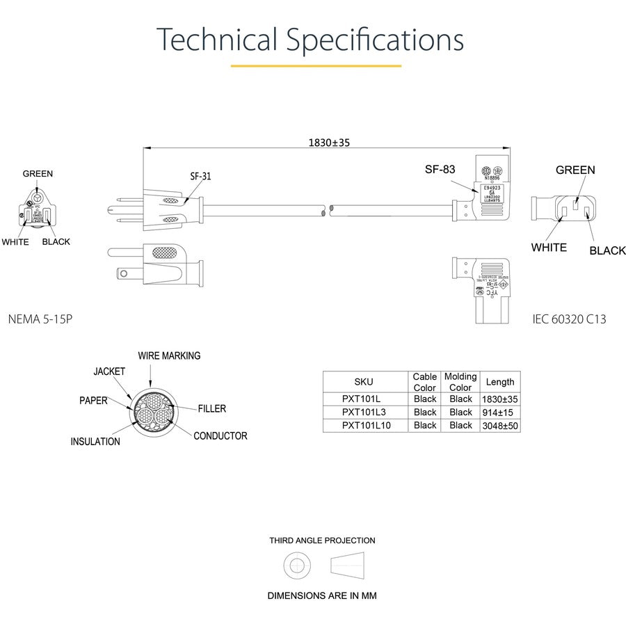 - AC POWER CABLE: This 6ft (1.8m) 18AWG flexible computer power cable with NEMA 5-15P and Right-Angle IEC 60320 C13 connectors is suitable for workstation/home office use