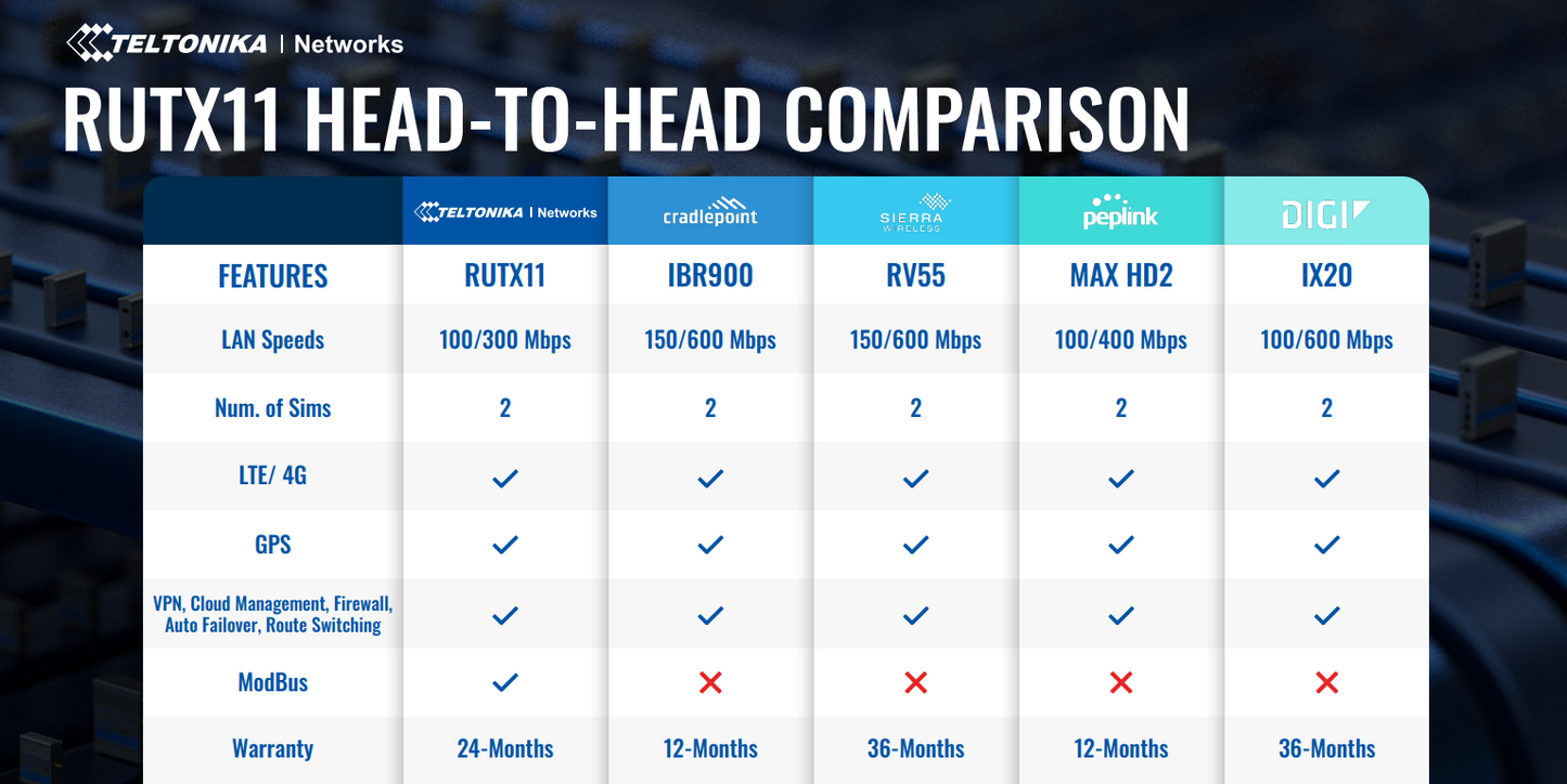 - RUTX11 is a very powerful device equipped with Dual-SIM with auto Failover, Backup WAN, and other SW features.